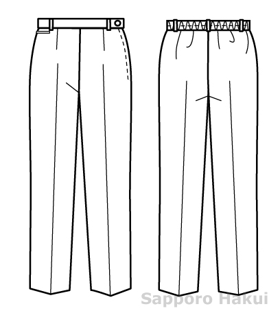 後ゴム入り、左脇ファスナー、左脇ボタン留め、右前脇ポケット