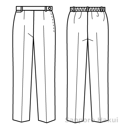 後ゴム入り、左脇ファスナー、左脇ボタン留め、右前脇ポケット