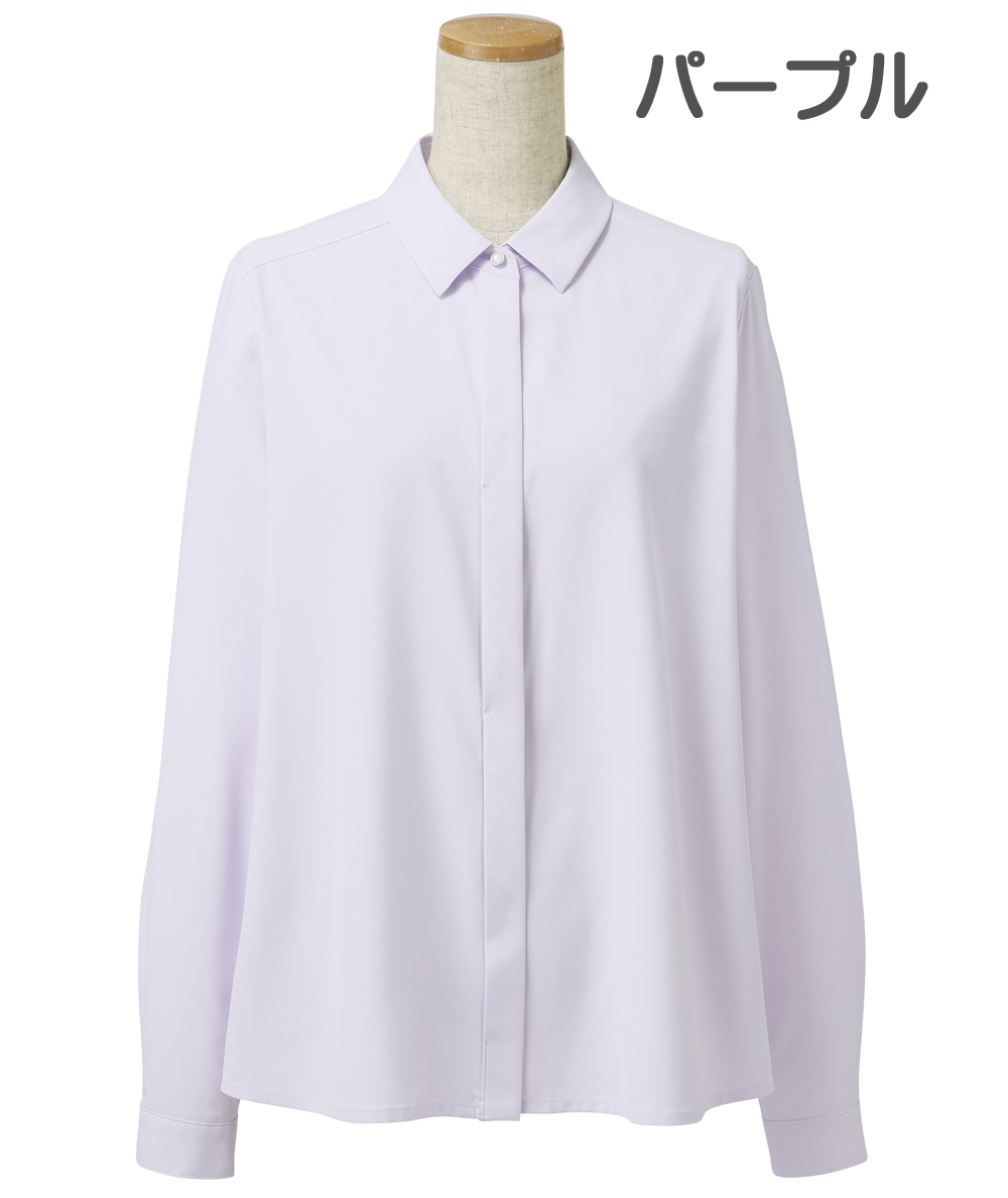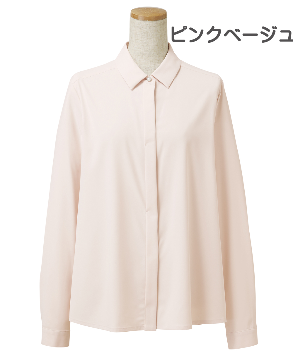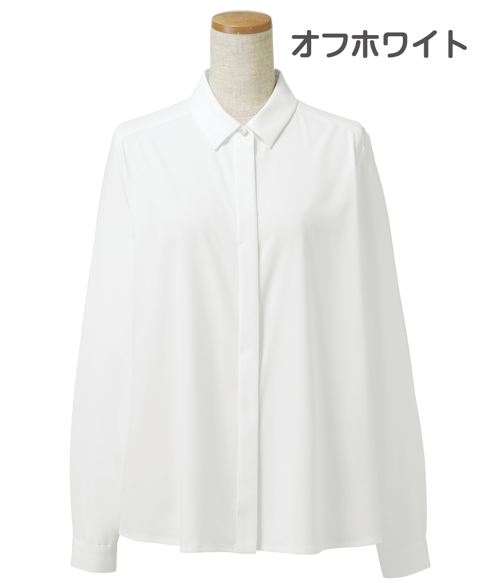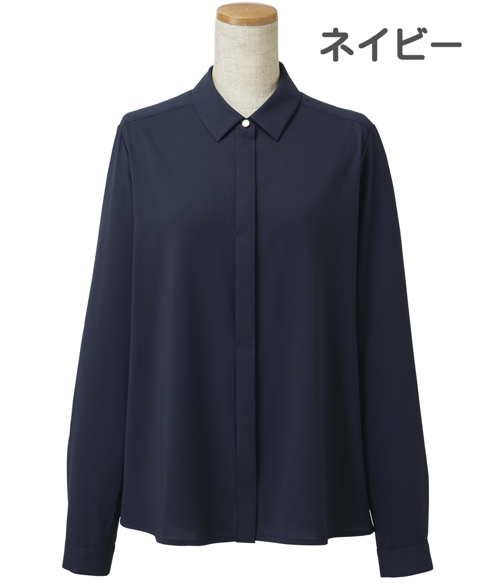 小さめカラーとボタンを隠したヒヨク仕立てがモダンなシャツブラウスと、